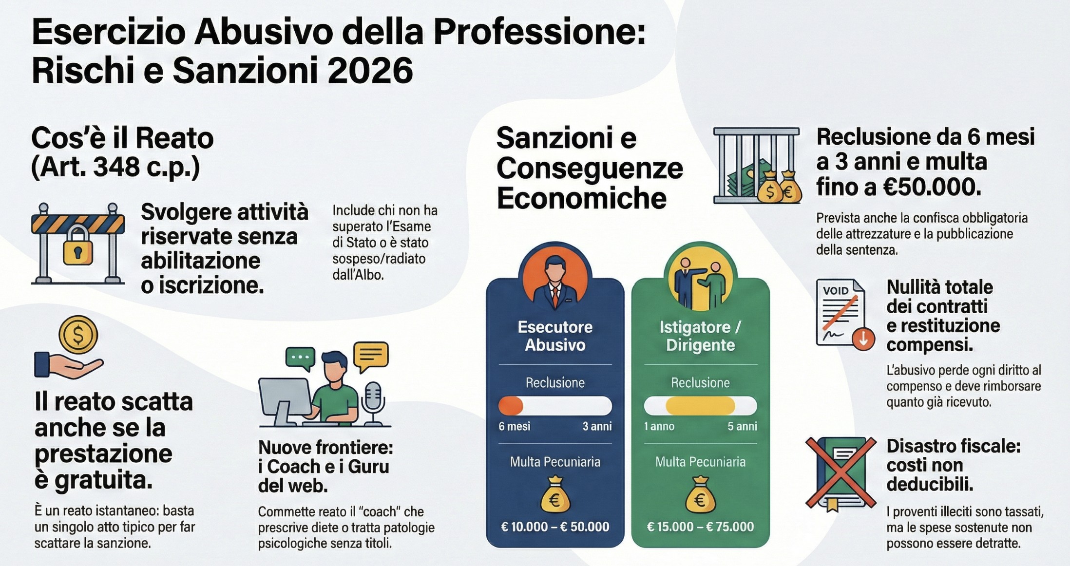 Esercizio abusivo della professione (art. 348 c.p.): sanzioni, confisca e rischi per il cliente nel 2026.