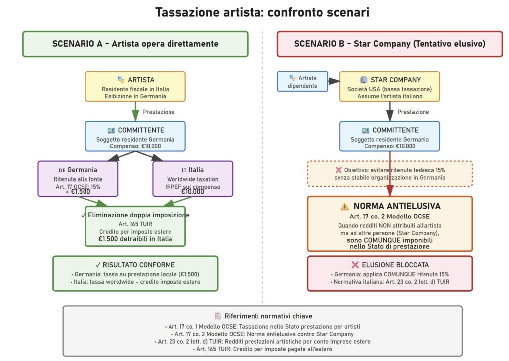 Al fine di prevenire questa possibile manovra elusiva, il paragrafo 2 dell’articolo 17 della Convenzione OCSE stabilisce che quando il reddito derivante dalle attività svolte dall’artista sono imputate ad un altro soggetto, la star company, i redditi possono comunque essere tassati nello stato in cui è erogata la prestazione. Dello stesso tenore, come abbiamo visto, anche l’art. 23, comma 2, lett d) del TUIR. Questa disposizione prevede tassazione in Italia anche nel caso in cui l’artista venga pagato da una società estera, nel caso in cui i compensi risultino imponibili in Italia, seguendo le disposizioni previste nel caso in cui l’artista operasse in modo indipendente.