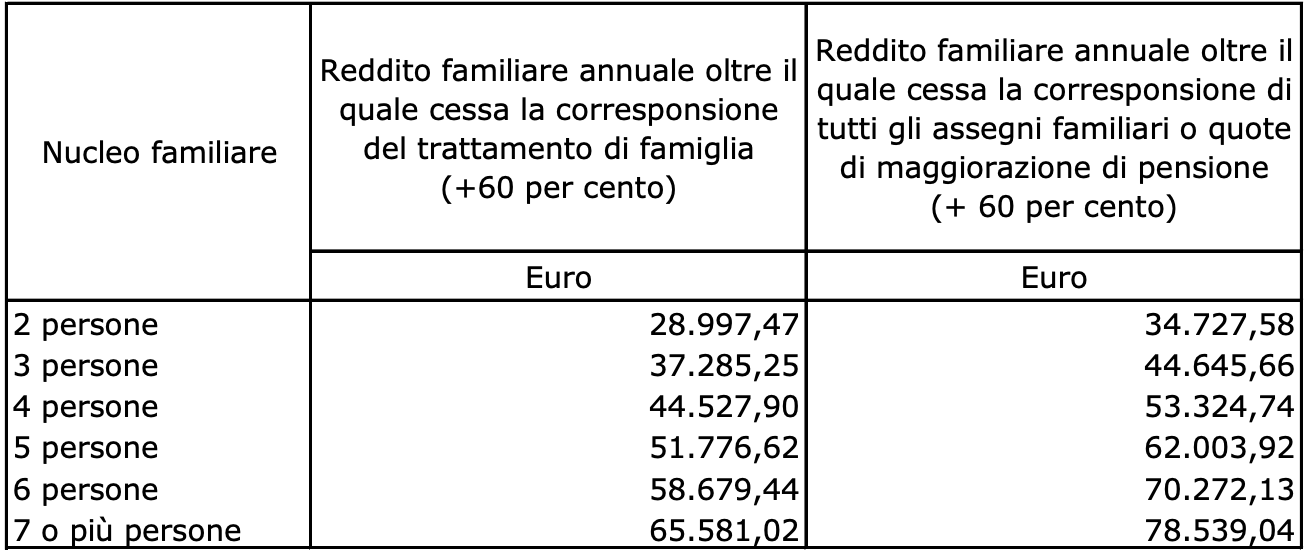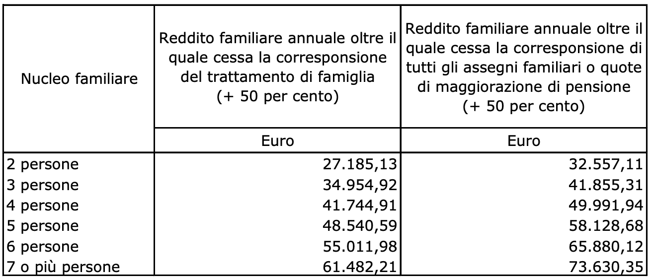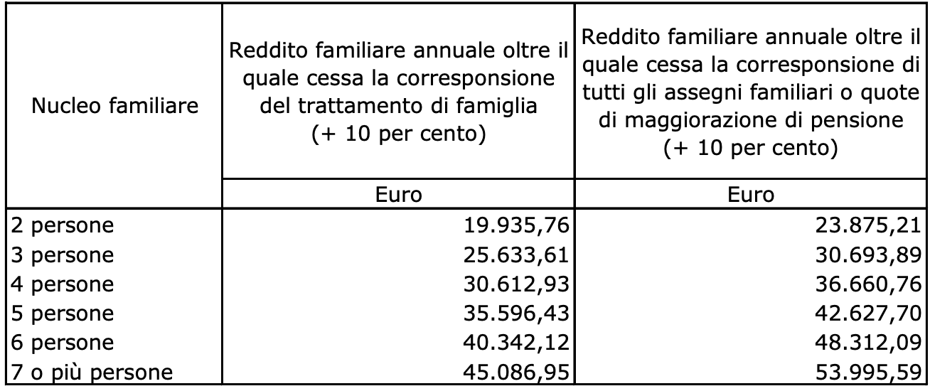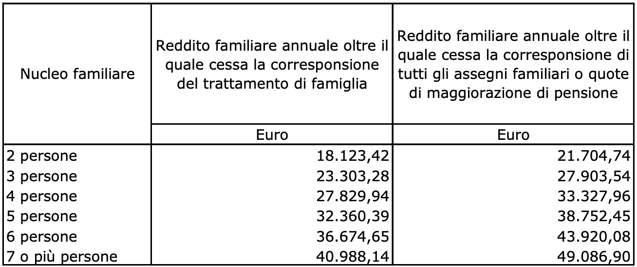 La tabella di seguito trova applicazione ai soggetti cui si corrispondono gli assegni familiari o le quote di maggiorazione di pensione e che siano nella condizione di vedovo/a, divorziato/a, separato/a legalmente, abbandonato/a, celibe o nubile.