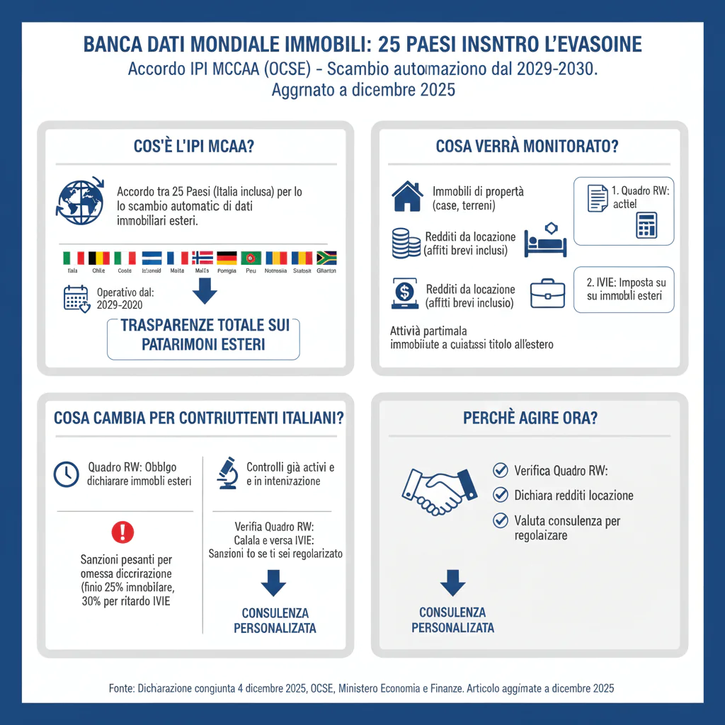 Il 4 dicembre 2025 venticinque Paesi hanno firmato una dichiarazione congiunta che segna una svolta nella lotta all’evasione fiscale internazionale. Per la prima volta su scala globale, le amministrazioni fiscali si scambieranno automaticamente le informazioni sui patrimoni immobiliari detenuti oltre confine dai contribuenti.