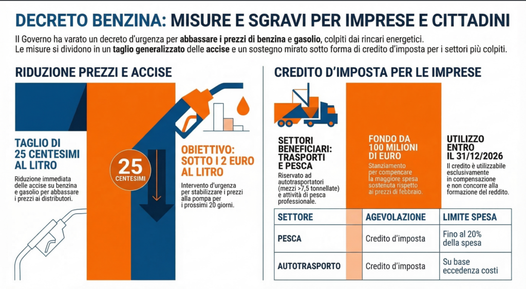 Il credito d’imposta è riconosciuto dalla maggiore spesa sostenuta per l’acquisto di carburante in ciascuno dei mesi di marzo, aprile e maggio rispetto al prezzo del mese di febbraio, come rilevato dal Ministero dell’Ambiente. Il credito potrà essere utilizzato esclusivamente in compensazione entro il 31 dicembre 2026 e non concorre alla formazione di reddito d’impresa né della base imponibile IRAP.