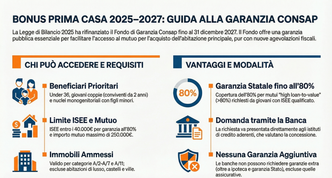 Il Fondo Consap è il principale sostegno per i giovani che vogliono acquistare casa. La Legge di Bilancio 2025 lo ha rifinanziato fino al 31 dicembre 2027. Il Fondo offre alle banche una garanzia pubblica del 50% del capitale finanziato fino a 250.000 euro per mutui destinati all’acquisto della prima casa. Per gli under 36 con un ISEE entro i 40.000 euro, la garanzia sale all’80% per i mutui che coprono dall’80% al 100% del prezzo dell’abitazione.