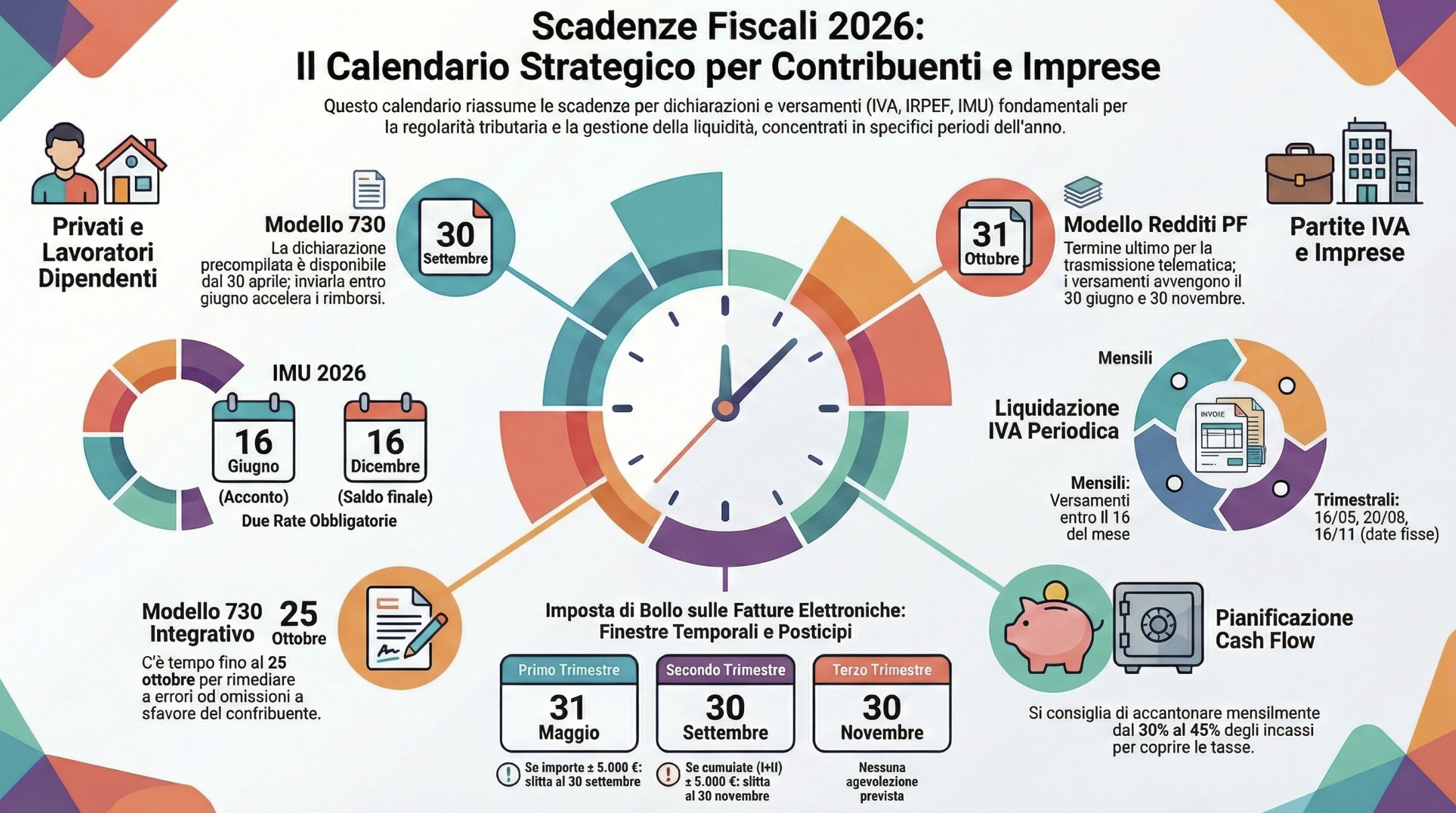 Il calendario fiscale 2026 rappresenta la bussola essenziale per privati, liberi professionisti e imprese per navigare in sicurezza tra gli obblighi tributari dell’anno. Che si tratti di presentare il Modello 730, versare l’IMU, oppure gestire le più complesse scadenze IVA e INPS, rispettare le date fissate dall’Agenzia delle Entrate è fondamentale per garantire la propria regolarità ed evitare pesanti sanzioni. Questa guida offre una mappatura completa di tutti gli appuntamenti fiscali del 2026 per ogni categoria di contribuente, arricchita da consigli strategici degli esperti su come pianificare i flussi di cassa e sopravvivere ai cosiddetti ‘mesi neri’ del Fisco, proteggendo la liquidità e la continuità del proprio business.