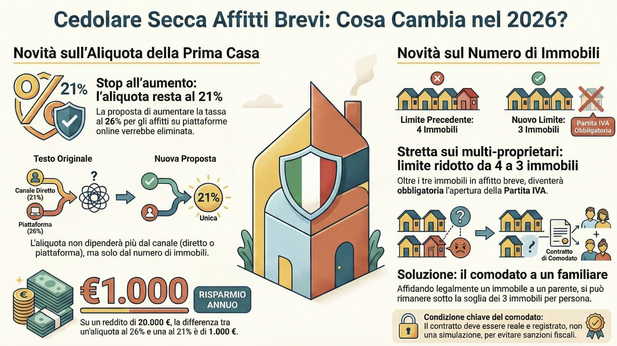 - Riduzione limite immobili: Se passa la proposta di riduzione da 4 a 3, chi gestisce quattro case dovrà riorganizzarsi entro fine anno.