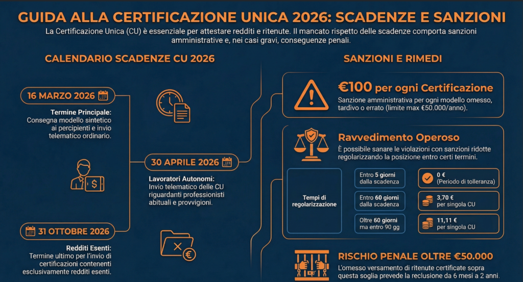 - Sanzione per Certificazione unica tardiva o errata: 100 euro per singolo modello con un limite massimo di 50.000 euro per anno e sostituto di imposta.