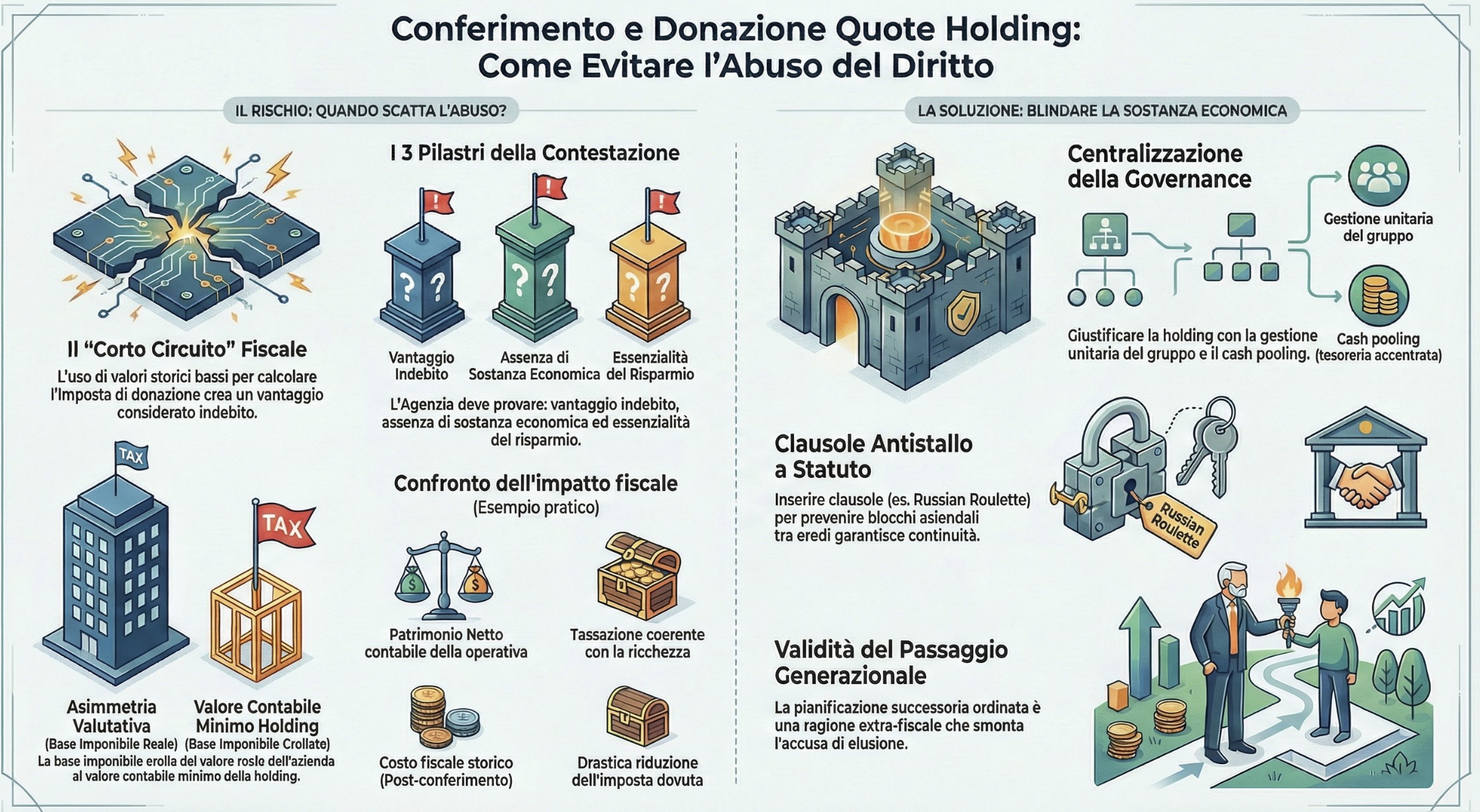 Secondo l'Agenzia delle Entrate, il conferimento di partecipazioni a realizzo controllato seguito dalla donazione della nuda proprietà genera un vantaggio fiscale indebito. Tuttavia, l'operazione è pienamente legittima e non abusiva se giustificata da solide ragioni extrafiscali (sostanza economica), come la centralizzazione della governance e l'inserimento di clausole antistallo nello statuto per garantire un passaggio generazionale senza conflitti.