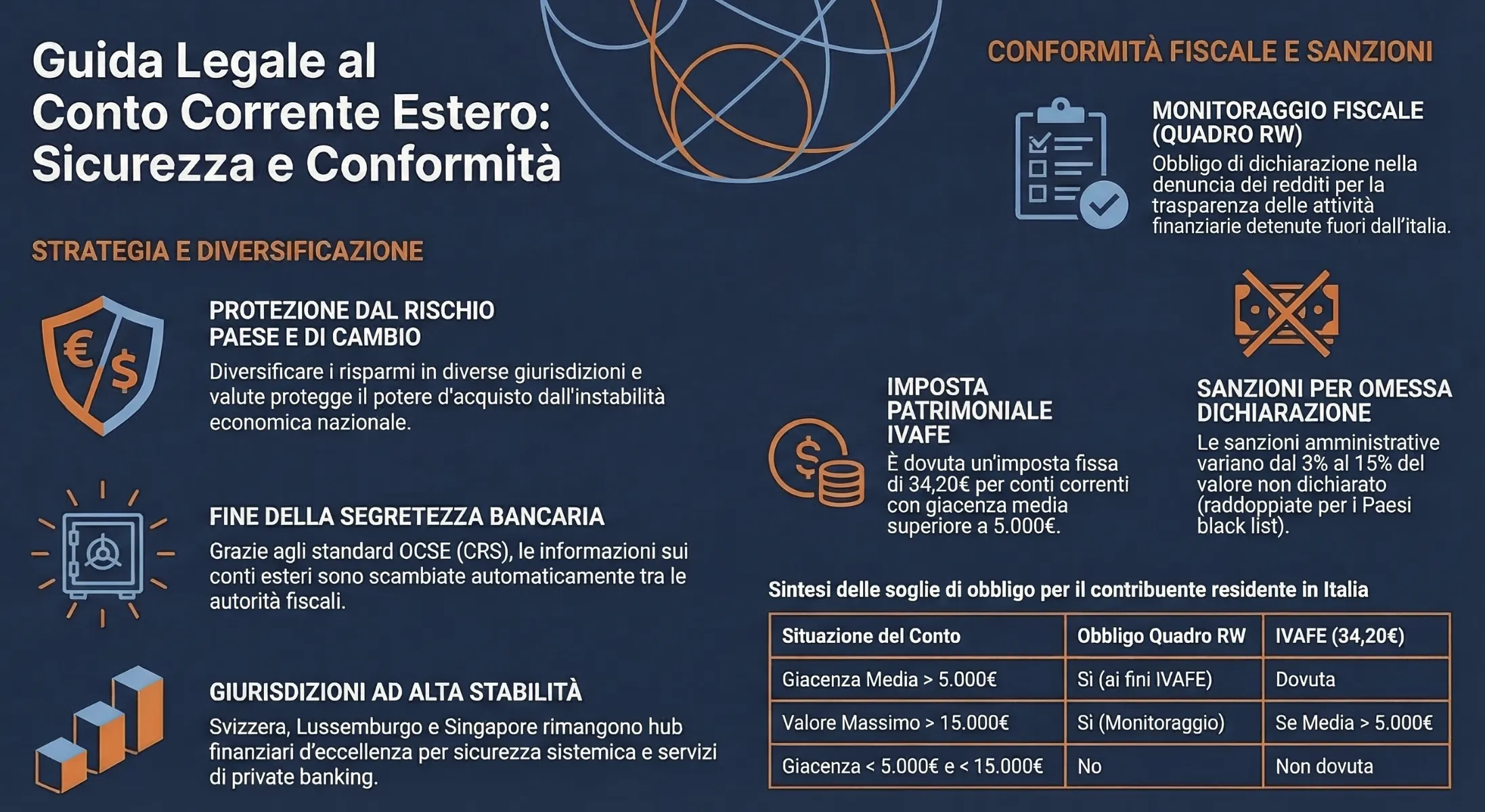 | Svizzera | Massima stabilità, sicurezza e discrezione. | Richiesto deposito iniziale elevato e documentazione completa. | Franco Svizzero (valuta rifugio). |