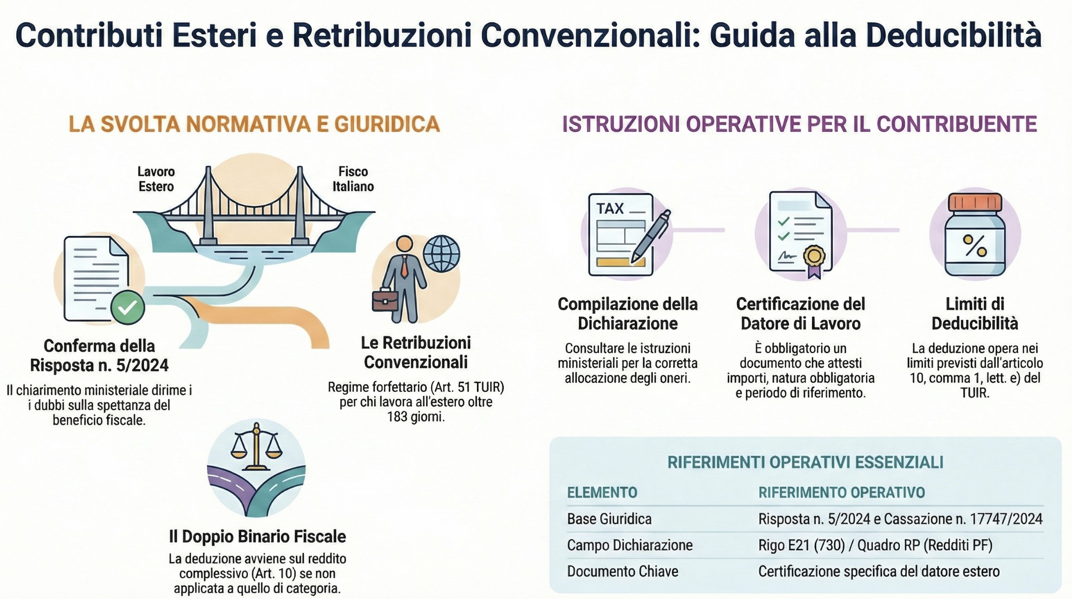 | Risp. Interpello n. 5 (15 gen 2026) | Deducibilità contributi esteri con retribuzioni convenzionali. | Deduzione in Dichiarazione: Rigo E21 (730) o Quadro RP. Doc: Certificazione specifica del datore (importi, obbligatorietà, periodo). | VIGENTE Conferma ufficiale: deducibilità ammessa dal reddito complessivo ex art. 10 TUIR. |