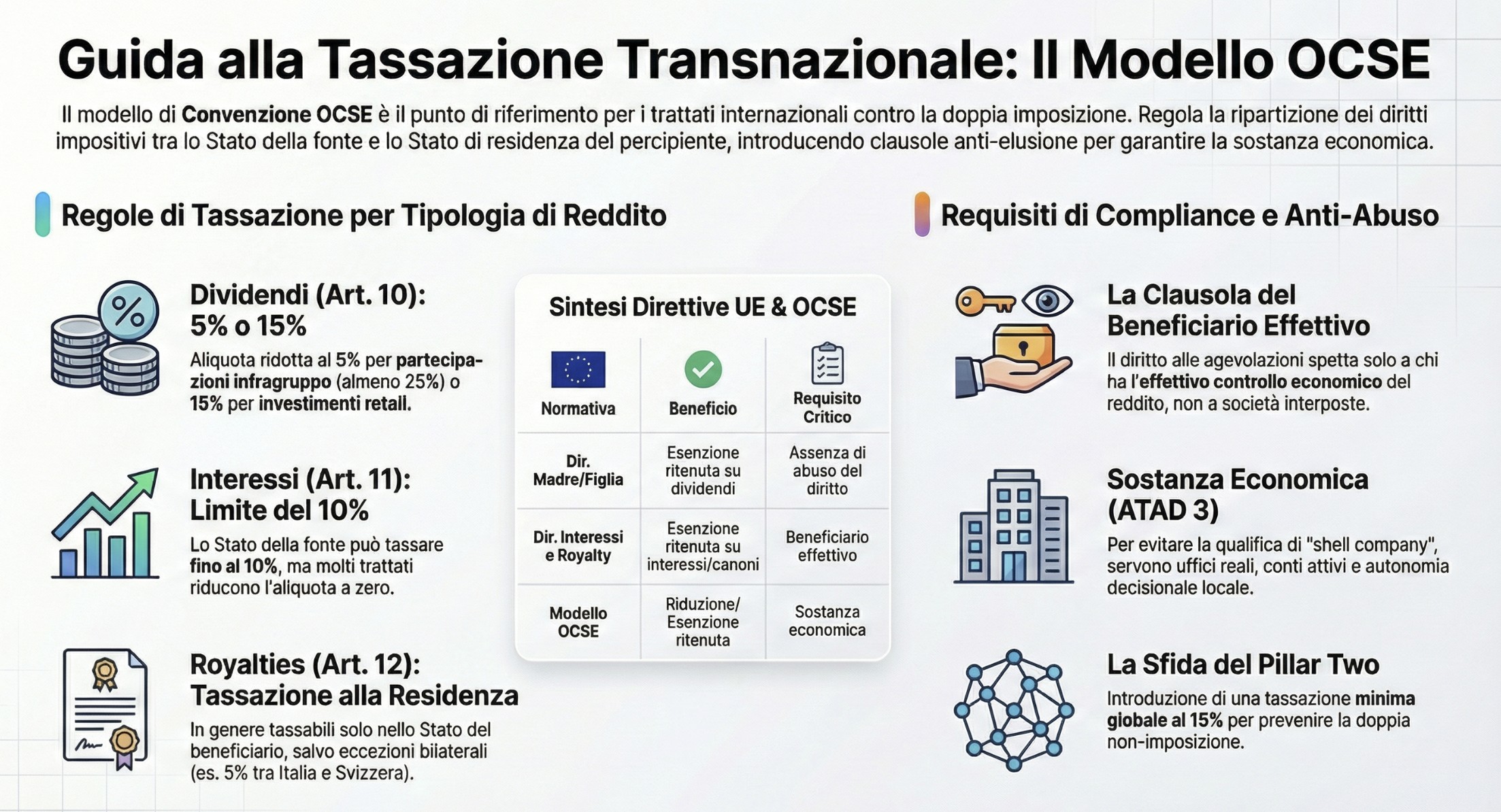 Guida alla tassazione di dividendi, interessi e royalties: regole del Modello OCSE e novità 2026 su beneficiario effettivo e sostanza economica.