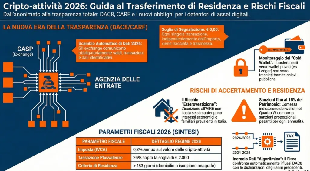 Il trasferimento della residenza fiscale per i detentori di cripto-attività nel 2026 è soggetto al nuovo framework di trasparenza DAC8/CARF, che abilita lo scambio automatico di informazioni tra CASP e Agenzia delle Entrate, rendendo obbligatoria la rendicontazione dei flussi in uscita e delle consistenze pregresse nel Quadro W.