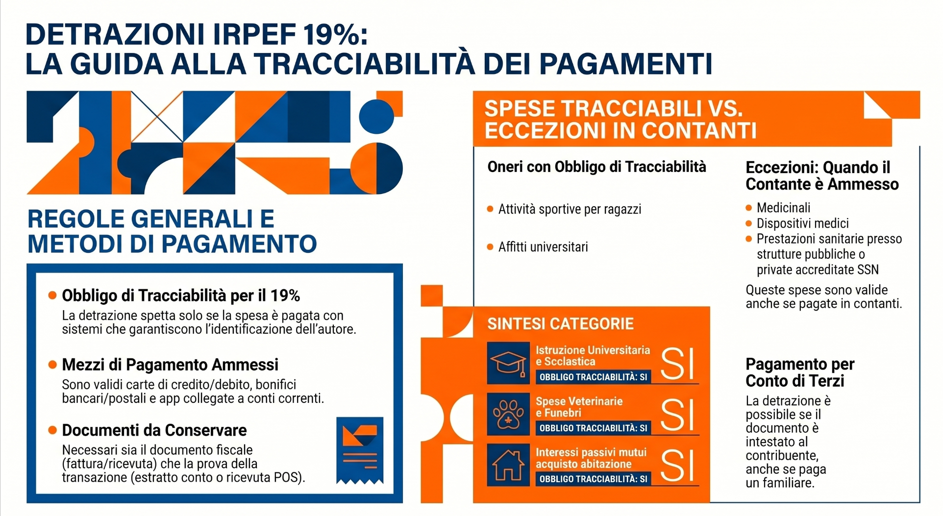 Le spese di cui all’art. 15 del TUIR, devono essere sostenute mediante mezzi di pagamento tracciabili ex art. 23 del D.Lgs. n. 241/97, come ad esempio, carte, bancomat ovvero bonifico bancario o postale, per poter beneficiare della detrazione fiscale al 19% (sono escluse le detrazioni con percentuali diverse) ai fini IRPEF.