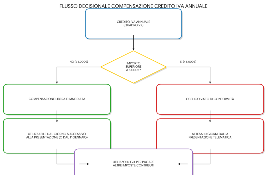 Spesso vedo crediti IVA “bloccati” perché si supera la soglia dei 5.000 euro senza avere il visto di conformità pronto. Attenzione: Il credito annuale > 5.000 euro può essere compensato solo a partire dal decimo giorno successivo alla presentazione della dichiarazione.