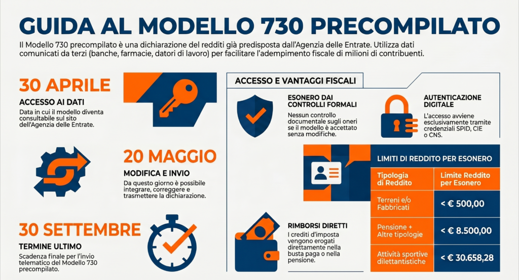 Occorre prestare comunque molta attenzione ai dati inseriti nel modello, in quanto potrebbero esserci omissioni o errori. Per questo motivo è consigliabile comunque avvalersi di un soggetto esperto, come un Commercialista, per la presentazione della dichiarazione reddituale. In questo modo eviterai di commettere errori e potrai adempiere in modo semplice ai tuoi obblighi fiscali. Sarà disponibile il Modello 730/2026 precompilato sul sito internet dell’Agenzia delle entrate www.agenziaentrate.gov.it/portale, a partire dal prossimo 30 aprile 2026.