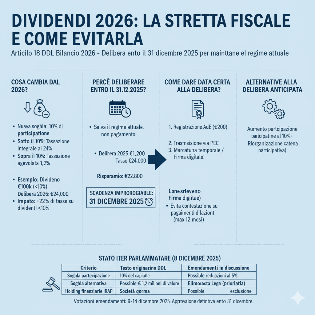 La delibera entro il 31 dicembre 2025 consente di applicare ancora l’attuale regime agevolato, con tassazione effettiva all’1,2% (24% sul 5% imponibile) anziché al 24% integrale previsto dal 2026. Rileva la data della delibera assembleare, non quella del pagamento materiale. Tuttavia l’Agenzia delle Entrate può contestare delibere con termini di pagamento eccessivamente dilazionati nel tempo.
