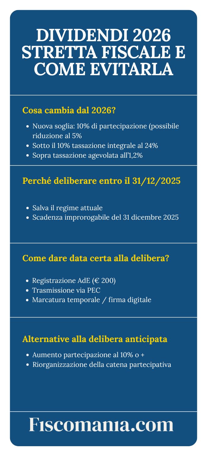 La delibera entro il 31 dicembre 2025 consente di applicare ancora l’attuale regime agevolato, con tassazione effettiva all’1,2% (24% sul 5% imponibile) anziché al 24% integrale previsto dal 2026. Rileva la data della delibera assembleare, non quella del pagamento materiale. Tuttavia l’Agenzia delle Entrate può contestare delibere con termini di pagamento eccessivamente dilazionati nel tempo.