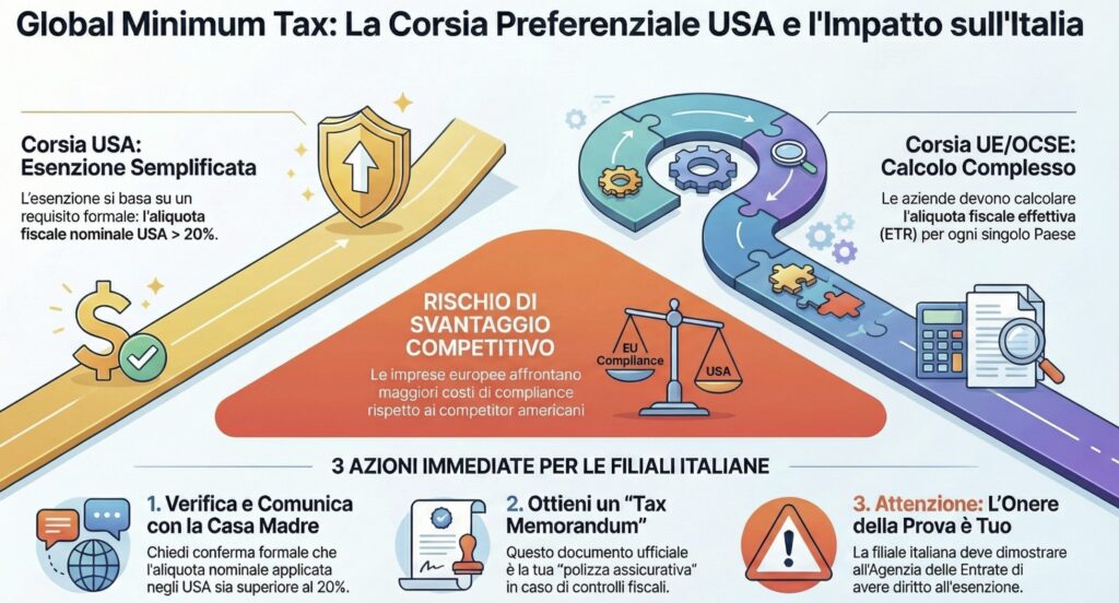 Nota bene: Per il safe harbour USA la soglia richiesta è del 20% (nominale), più alta del 15% (effettiva) standard della GloBE Tax.