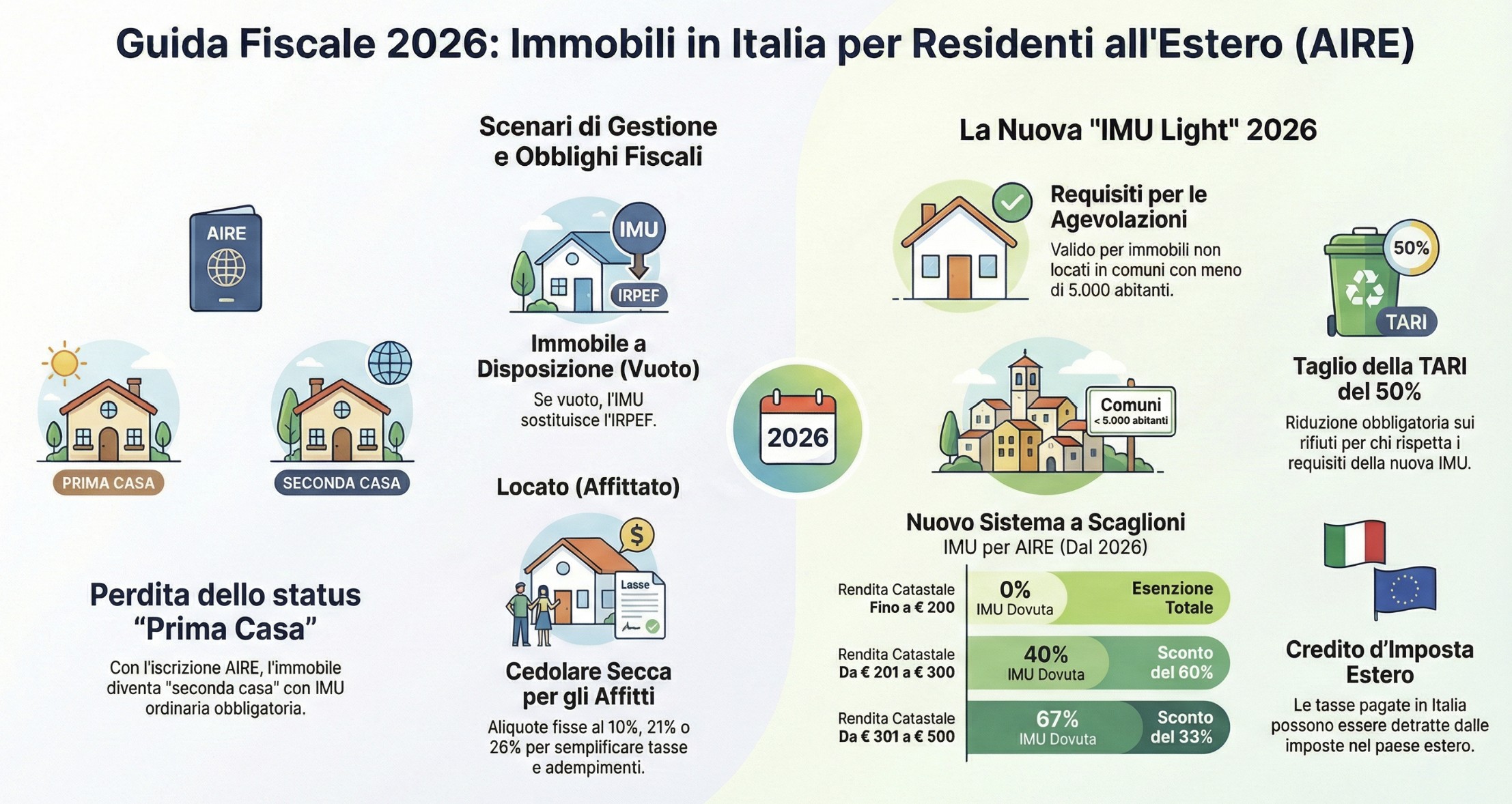 Gli immobili in Italia di proprietà di residenti all’estero iscritti AIRE sono soggetti a IMU in tutti i casi. Se tenuti a disposizione, l’IMU sostituisce l’IRPEF e non serve dichiarazione dei redditi. Se locati, i canoni si tassano con IRPEF ordinaria o cedolare secca (21%, 10% o 26%) e serve dichiarazione italiana. Dal 2026 entra in vigore la nuova IMU Light con esenzioni e riduzioni per immobili nei comuni sotto 5.000 abitanti (L. 178/2020; proposta di legge AIRE 2026 in iter Senato).