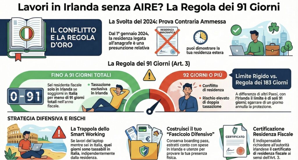 Eppure, la salvezza esiste e si trova in un documento del 1971. La Convenzione contro le doppie imposizioni tra Italia e Irlanda contiene una “regola aurea” unica nel suo genere, la regola dei 91 giorni, che può ribaltare l’esito di un accertamento fiscale, facendo prevalere la sostanza della tua presenza a Cork o Dublino sulla forma burocratica dell’anagrafe italiana.