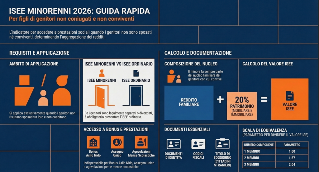 Per il calcolo occorre prendere in considerazione la condizione del genitore non coniugato e non convivente per stabilire se essa incida o meno sull’ISEE del nucleo familiare del minore.
