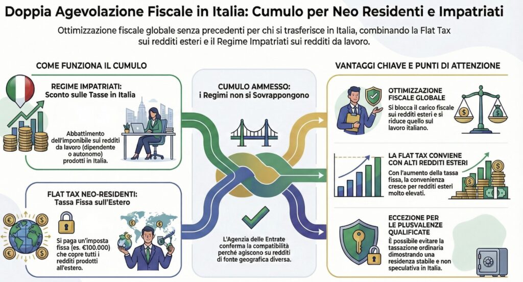 Il trasferimento di residenza in Italia per le persone fisiche ad alto potenziale economico (High Net Worth Individuals) diventa ancora più attrattivo. Un recente orientamento dell’Agenzia delle Entrate, contenuto in una risposta a interpello non ancora pubblicata ufficialmente ma anticipata dalla stampa specializzata, ha chiarito che non esiste un divieto normativo al cumulo tra due dei regimi più favorevoli del nostro ordinamento: la tassa fissa (flat tax) per i neo-residenti e il regime lavoratori impatriati.