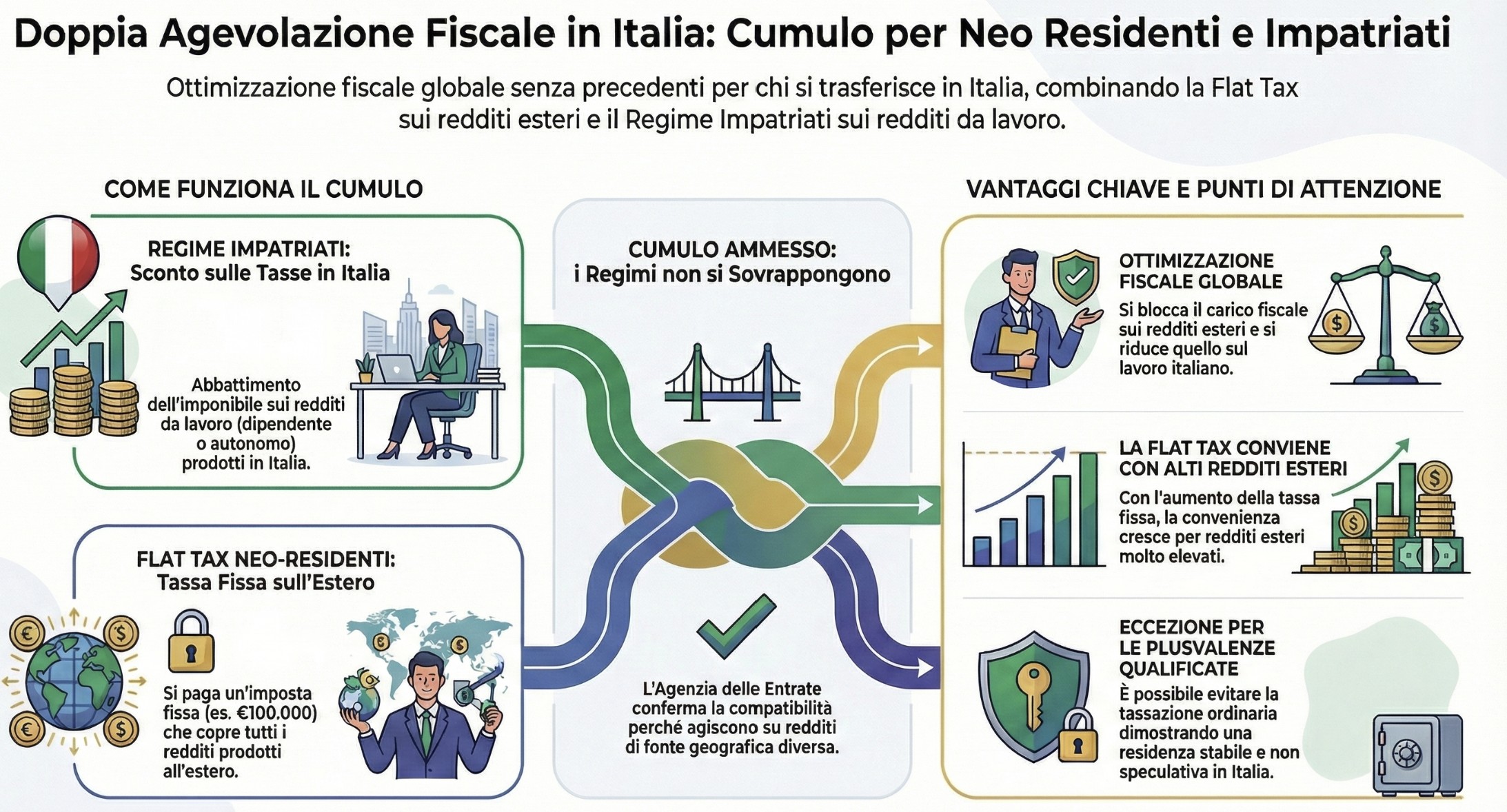 - Il meccanismo: I due regimi agiscono su ambiti non sovrapposti: redditi di fonte estera per la flat tax, redditi di fonte italiana (lavoro) per gli impatriati.