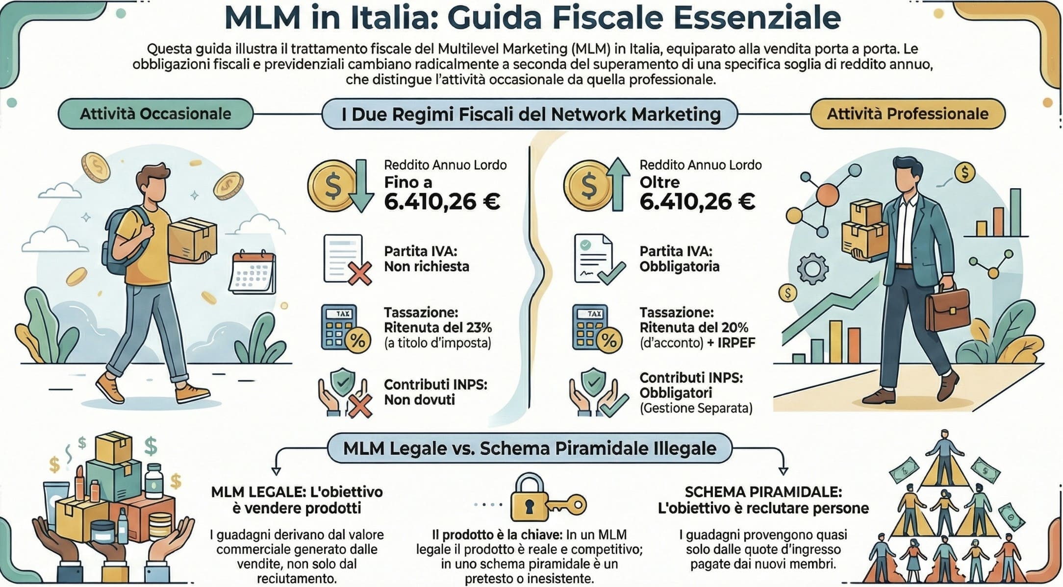 La normativa fiscale nazionale equipara il network marketing alla vendita porta a porta, disciplinata dall’art. 3 della Legge n. 173/2005. L’inquadramento tributario varia in base ai volumi di provvigioni realizzate.