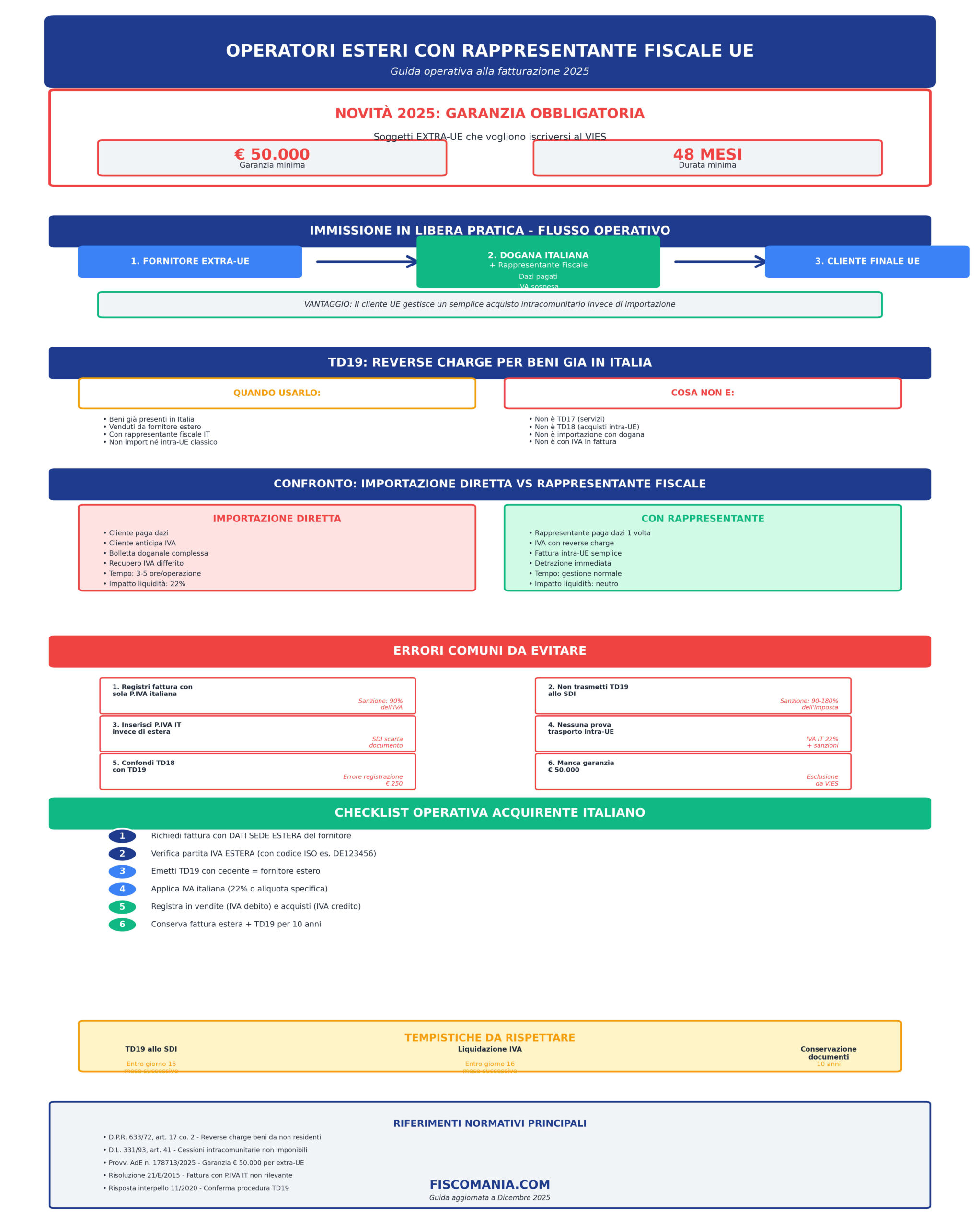 Il fornitore extra-UE vende i beni presenti in Italia a un cliente italiano. Non emette fattura con sola partita IVA italiana del rappresentante. Deve emettere fattura indicando: