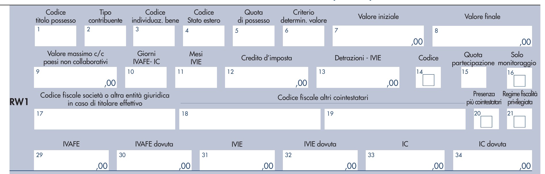 Il quadro RW deve essere così compilato: