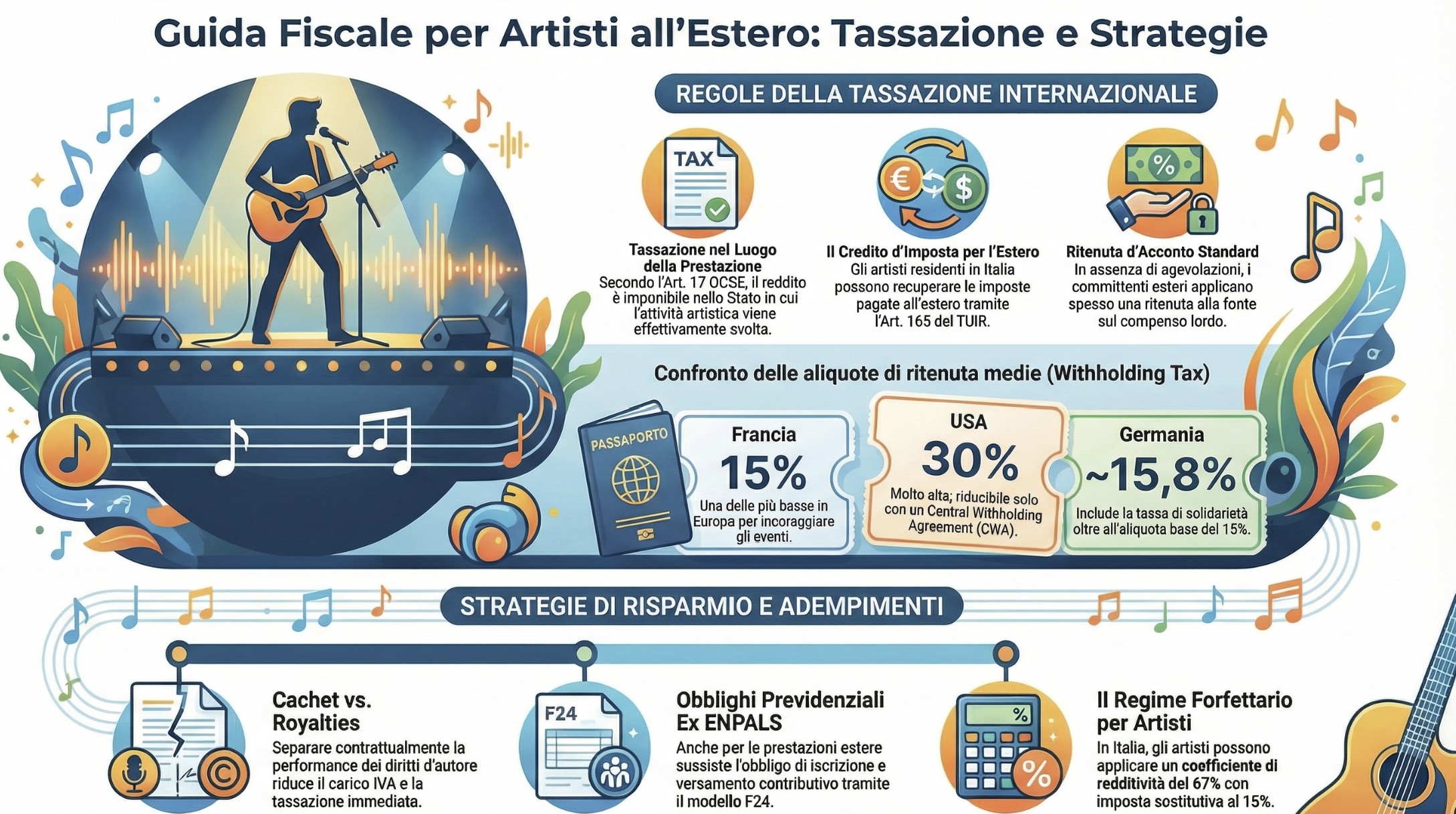 Le prestazioni artistiche svolte all’estero da parte dell’artista fiscalmente residente sono soggette a tassazione nello Stato di svolgimento dell’opera (sotto forma di withholding tax) e nello Stato di residenza fiscale, con applicazione del credito per imposte estere per attenuare la doppia imposizione.