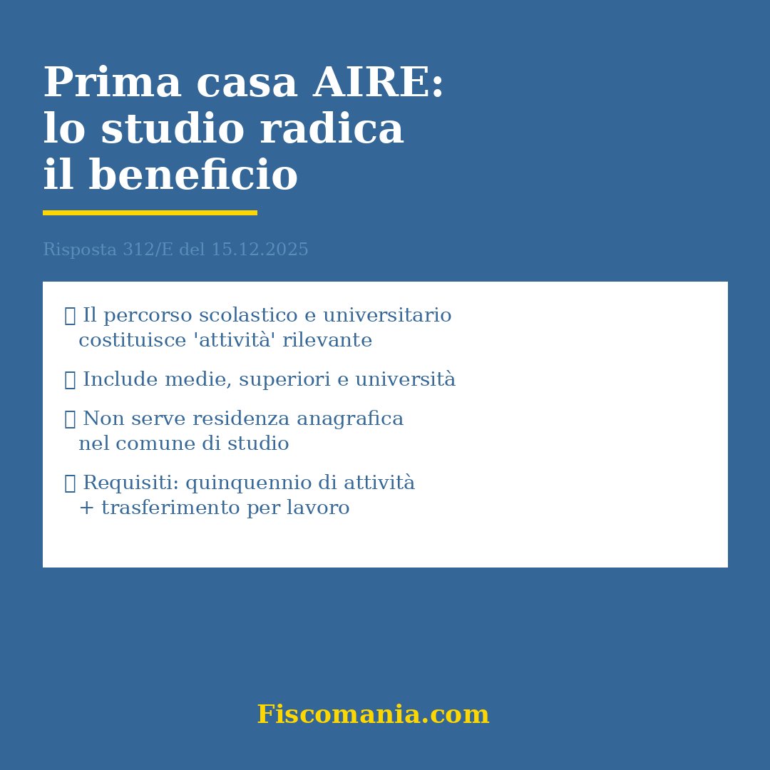 La Risposta a interpello n. 312 del 15 dicembre 2025 rappresenta il primo pronunciamento ufficiale che include espressamente il percorso formativo completo (scuole medie, superiori e università) tra le “attività” rilevanti per radicare l’agevolazione prima casa AIRE. Prima di questo documento, esisteva incertezza operativa tra i professionisti sull’applicabilità del beneficio al comune di studio quando questo non coincidesse con quello di nascita o di ultima residenza.