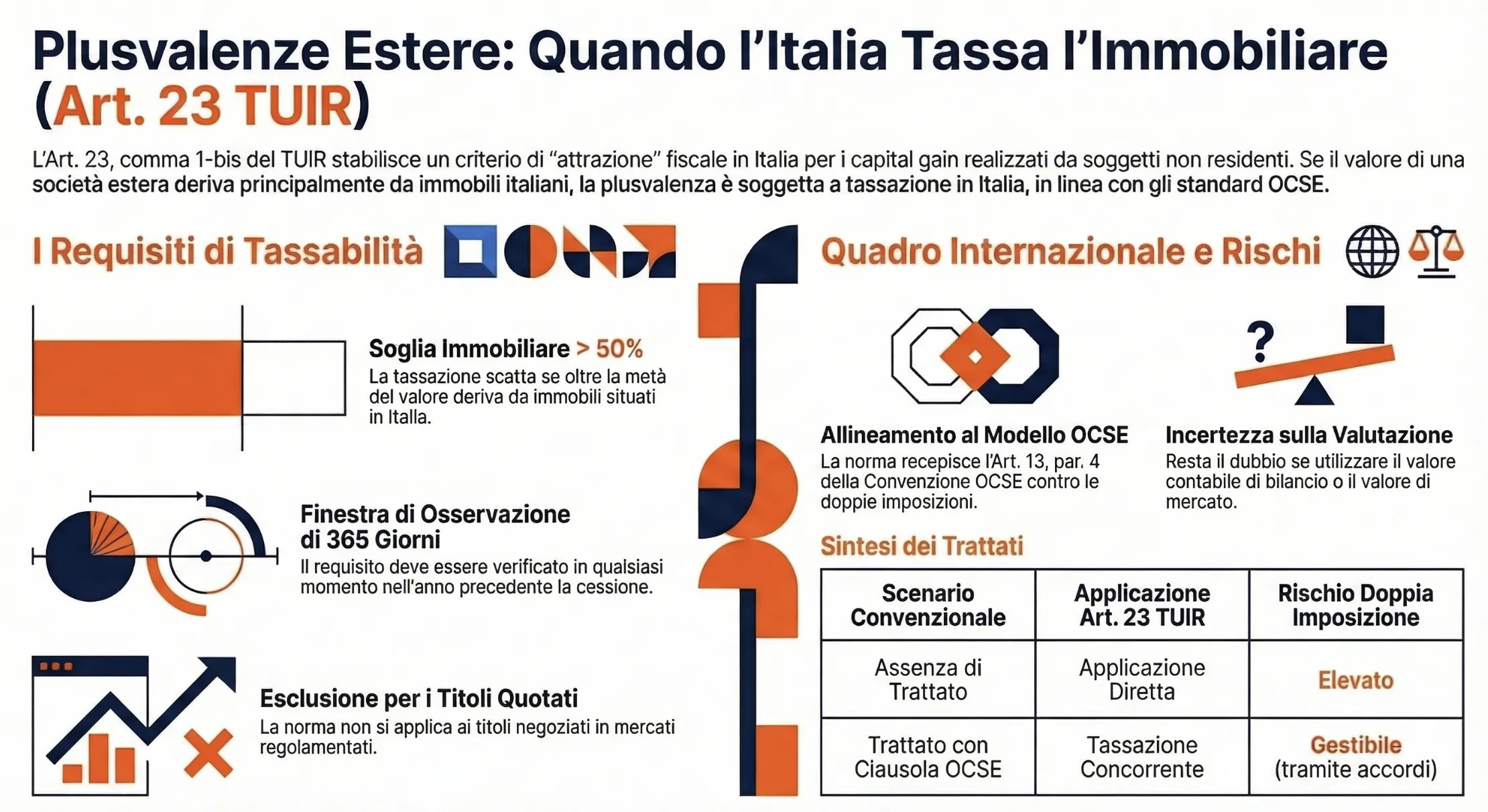 • Art. 23, comma 1-bis del TUIR: Definisce l’attrazione a tassazione in Italia delle plusvalenze su società immobiliari estere.