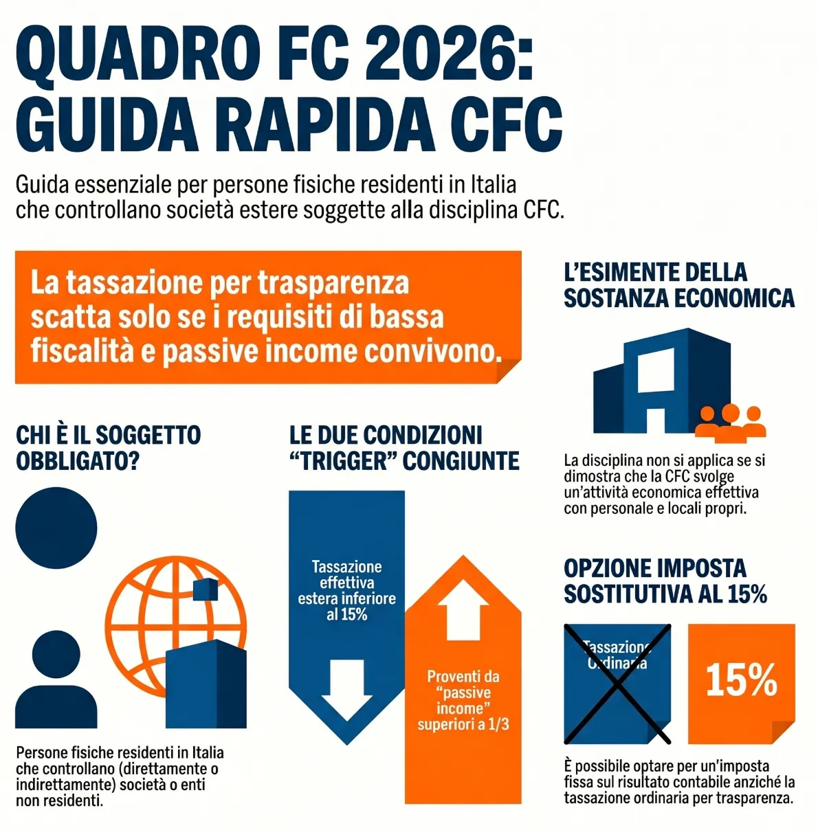 Il quadro FC del modello Redditi P.F. deve essere compilato dalle persone fisiche che controllano soggetti non residenti, (ex art. 167 del TUIR). In particolare, si tratta della normativa sulle società estere controllate, c.d. “normativa CFC“, secondo la quale la persona fisica residente che detiene il controllo di società estere che soddisfano determinati requisiti (indicati nel co. 4 del sopra indicato articolo) devono imputare per trasparenza il reddito prodotto da queste società per essere assoggettato a tassazione. Il quadro FC del modello redditi assolve la funzione di determinare il reddito imponibile in Italia delle società estere, ai fini della disciplina in commento.