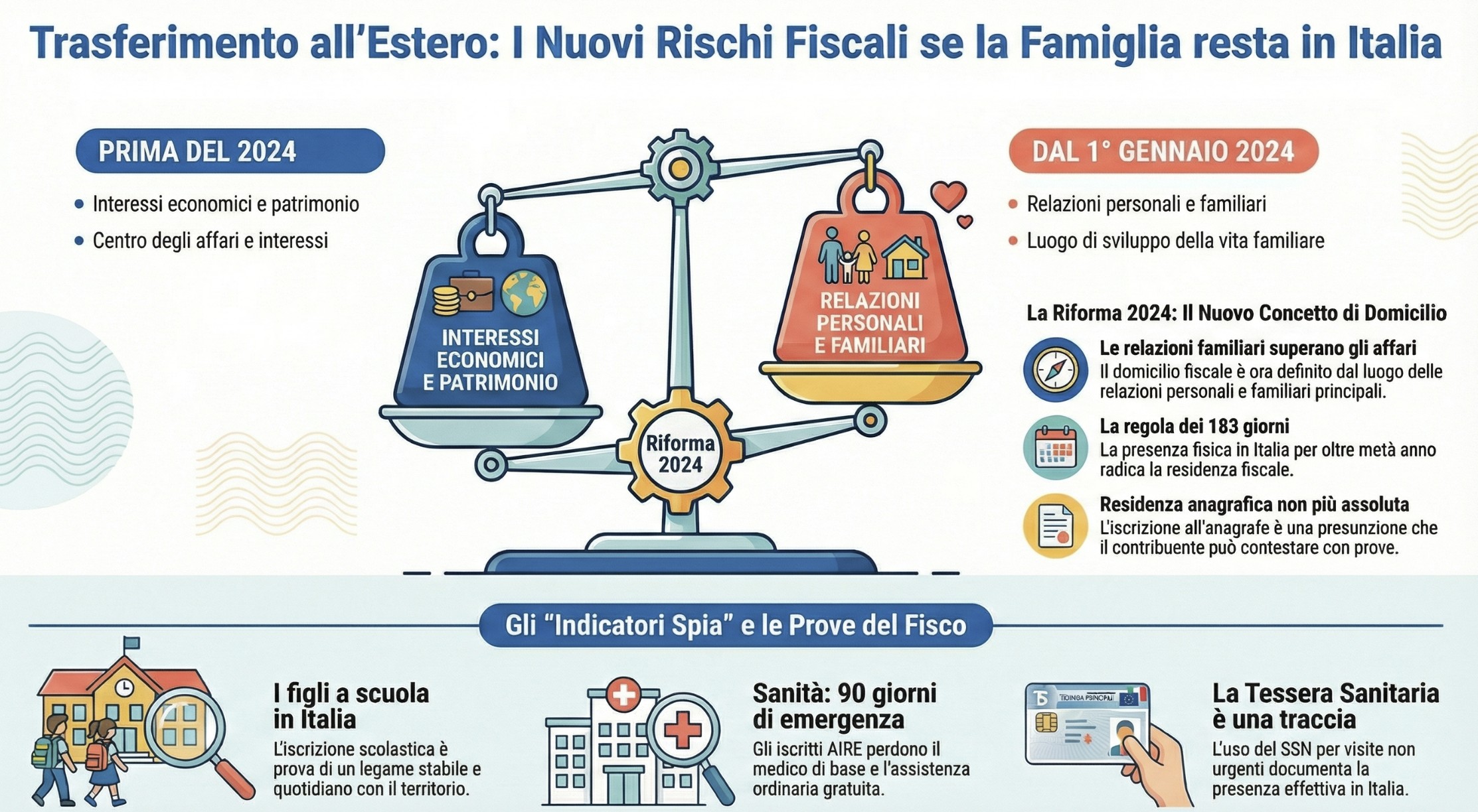 In questo articolo analizziamo come questi due elementi, apparentemente neutri, possono trasformarsi in prove decisive contro la tua posizione fiscale, quali sono le recenti novità normative introdotte dalla Riforma della Fiscalità Internazionale (D.Lgs. n. 209/23) e quali strategie difensive puoi adottare per blindare un trasferimento all’estero quando la famiglia resta in Italia.