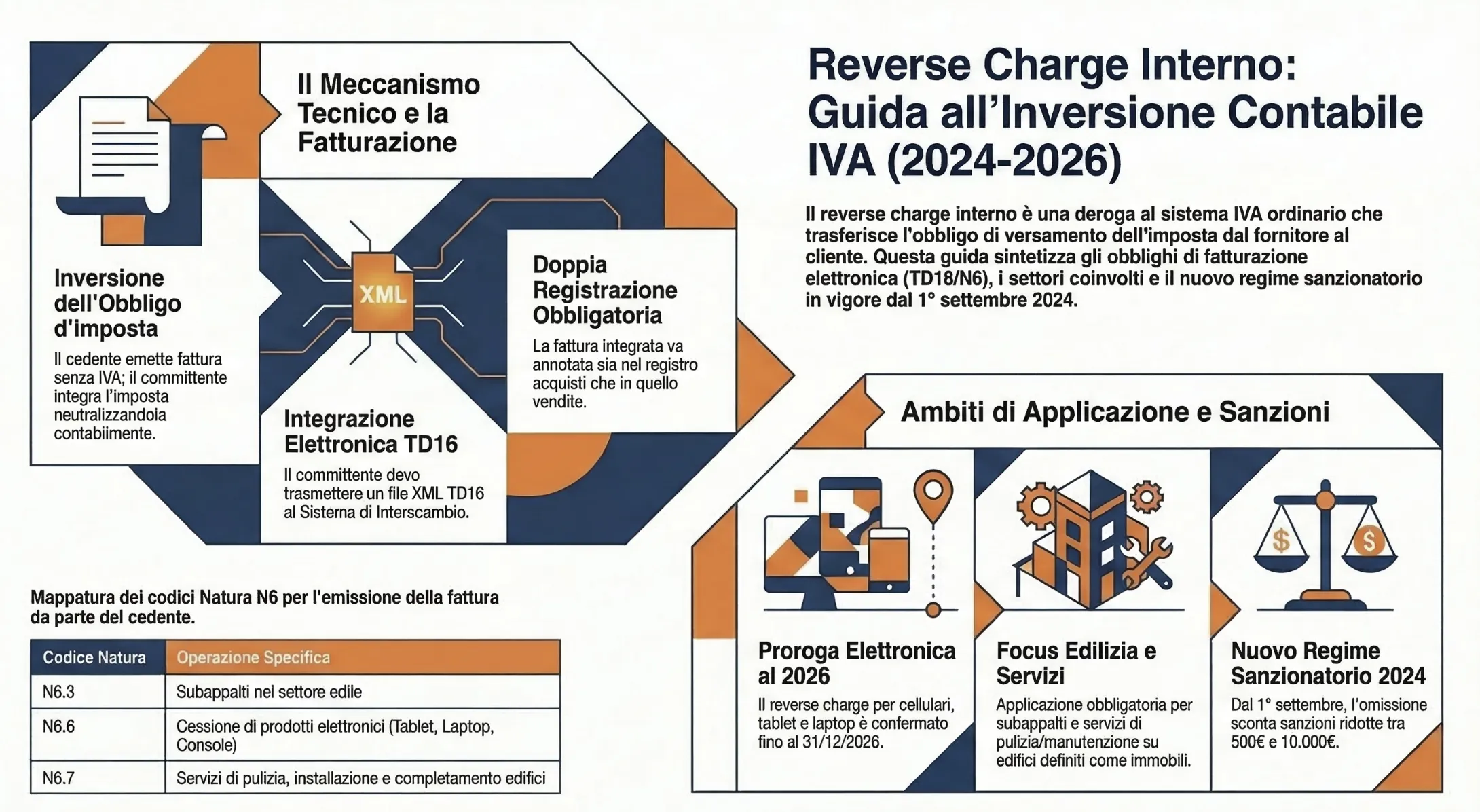 Il reverse charge interno (o inversione contabile) è il meccanismo fiscale che trasferisce l’obbligo di versamento dell’IVA dal fornitore al committente dell’operazione. Scopri in questa guida aggiornata come gestire l’integrazione della fattura elettronica tramite il documento TD16, quali codici Natura N6 utilizzare, le proroghe valide fino al 2026 per il settore elettronico e il nuovo regime sanzionatorio ridotto in vigore dal 1° settembre 2024.