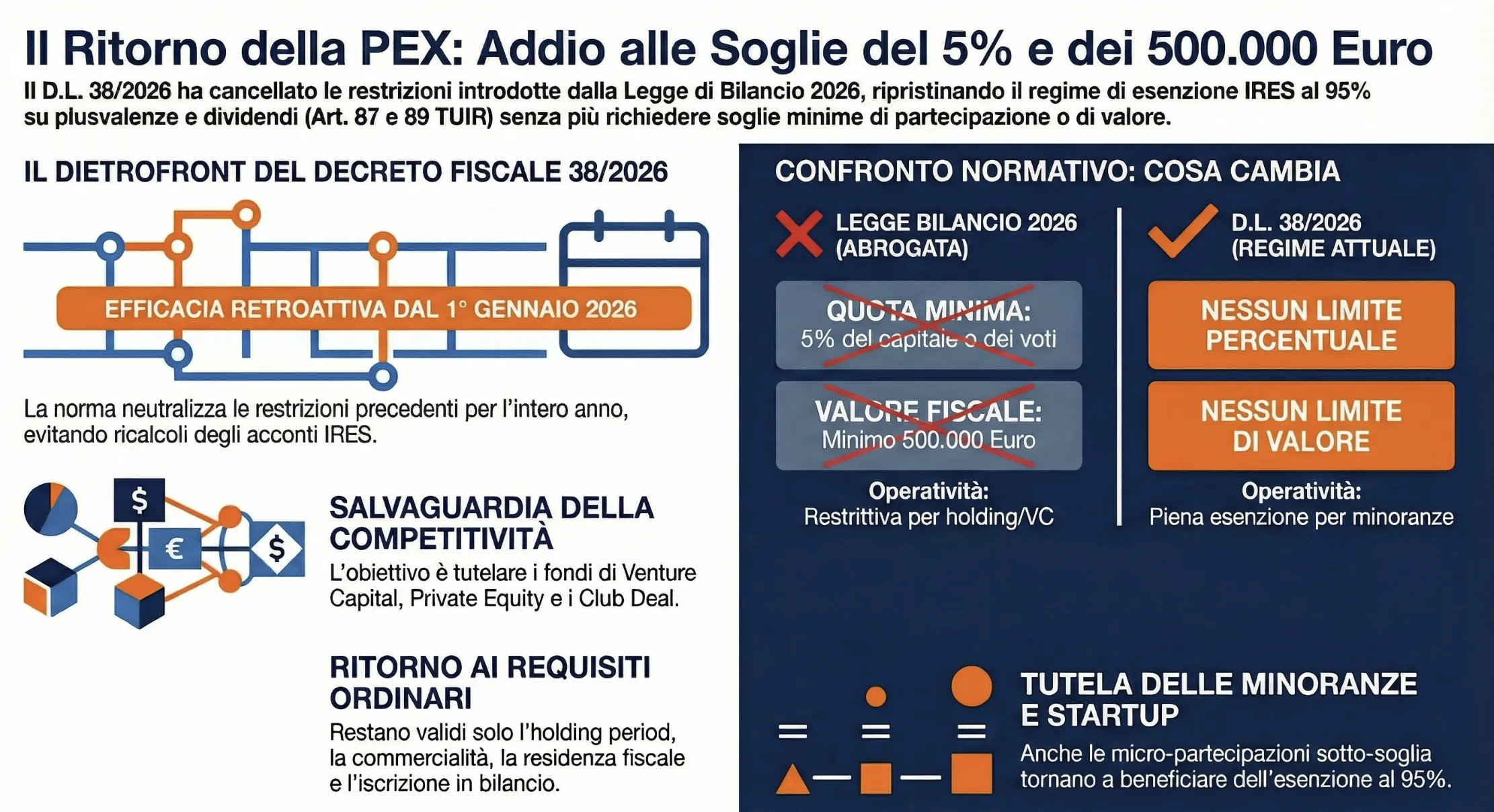 Ecco una sintesi chiara di come il nuovo Decreto Fiscale ha neutralizzato le penalizzazioni della Legge di Bilancio 2026 in materia di PEX ed esenzione dividendi.