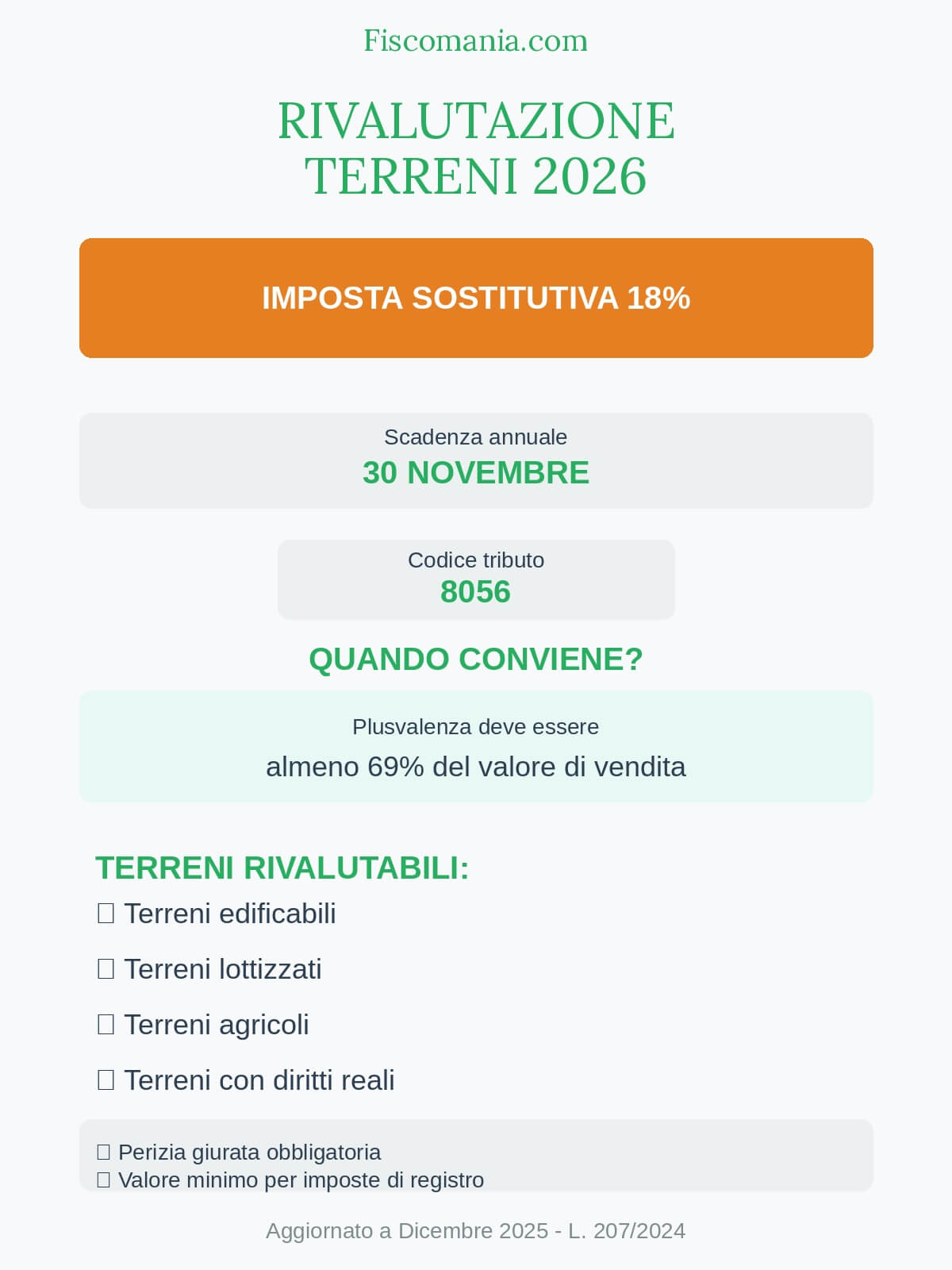 La norma originaria risale alla Legge n. 448/2001 (art. 7) ed è stata prorogata annualmente per oltre 20 anni. La Legge di Bilancio 2025 (L. 207/2024, art. 1, comma 30) l’ha finalmente stabilizzata: ogni anno, entro il 30 novembre, puoi rivalutare i terreni posseduti al 1° gennaio.