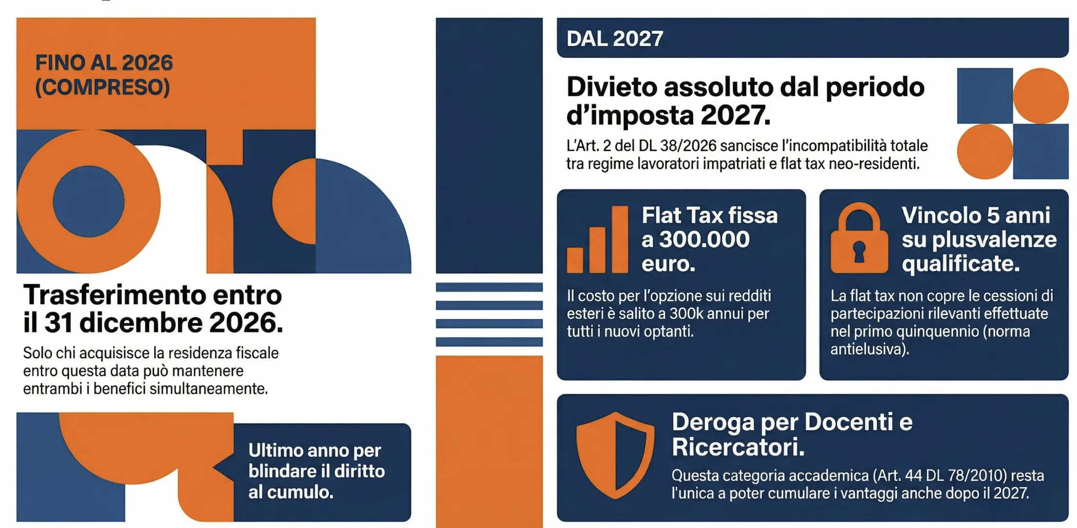 Fino al 2026 il cumulo è consentito per chi trasferisce la residenza in Italia. A partire dall’anno d’imposta 2027, l’art. 2 del DL 38/2026 vieta espressamente l’applicazione simultanea di entrambe le agevolazioni fiscali.