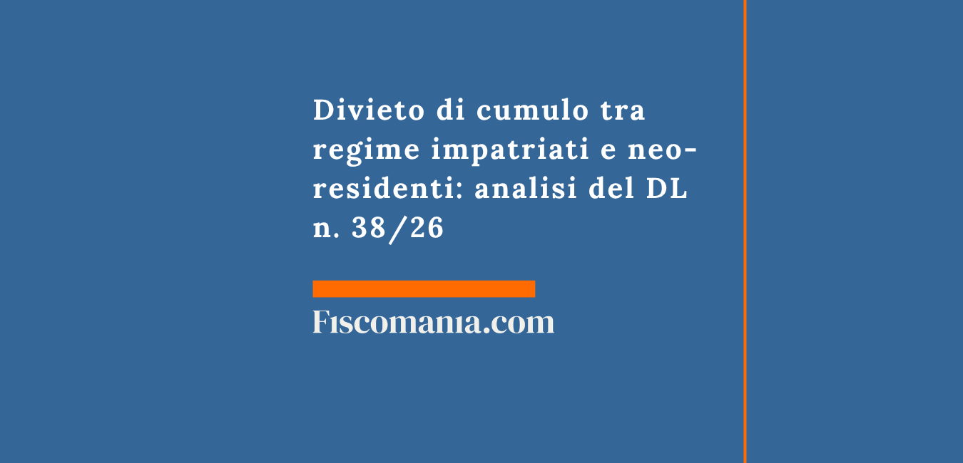 A partire dal periodo d’imposta 2027, l’articolo 2 del D.L. n. 38/2026 introduce il divieto assoluto di cumulo tra la flat tax sui redditi esteri per i neo-residenti, disciplinato dall’art 24-bis TUIR, e il regime agevolato per i lavoratori impatriati, regolato dall’art. 5 D.Lgs. n. 209/2023 e dal previgente art. 16 D.Lgs. 147/2015. I contribuenti che trasferiranno la residenza fiscale in Italia entro il 2026 mantengono la facoltà di applicare congiuntamente entrambe le agevolazioni.