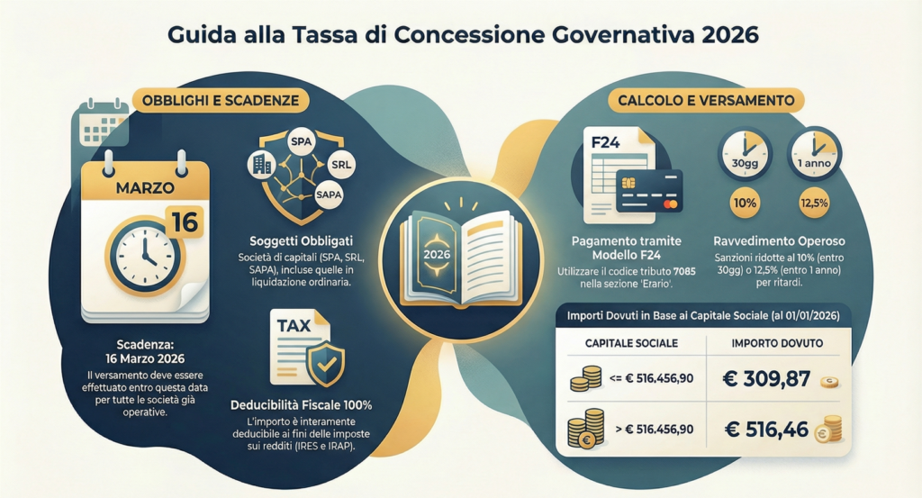 Si tratta di una tassa annuale di importo fisso, dovuto a prescindere dal numero dei libri o registri sociali e dal numero delle relative pagine. Il parametro in base al quale è determinata la tassa è costituito dal “capitale sociale o dal fondo di dotazione” della società al 1° gennaio dell’anno di riferimento. Il versamento dovrà essere effettuato mediante modello F24 entro il 16 marzo. Per le società costituende il versamento dovrà essere effettuato utilizzando apposito bollettino postale.