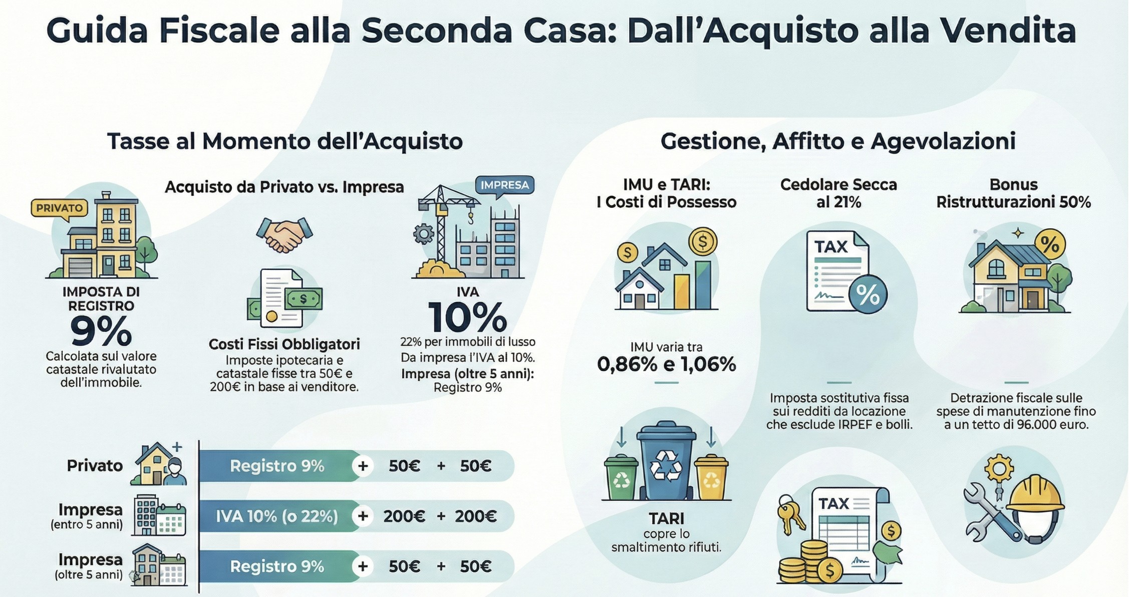 L’acquisto di una seconda casa rappresenta un investimento significativo, sia come proprietà per le vacanze che come fonte di reddito attraverso l’affitto. Tuttavia, comporta una serie di obblighi fiscali che è essenziale conoscere per evitare sanzioni e ottimizzare i costi. Questa guida esamina in dettaglio le imposte da considerare durante l’acquisto e il possesso di una seconda casa in Italia.