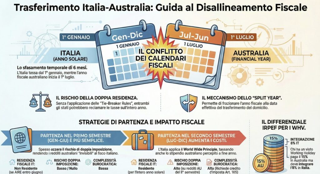 Questo sfasamento rende complesso il calcolo dei 183 giorni per la determinazione della residenza fiscale (ex art. 2, comma 2, TUIR) e, soprattutto, complica l’applicazione del credito per le imposte pagate all’estero (ex art. 165 TUIR), poiché le imposte australiane diventano definitive in un momento diverso rispetto alla scadenza della dichiarazione italiana.