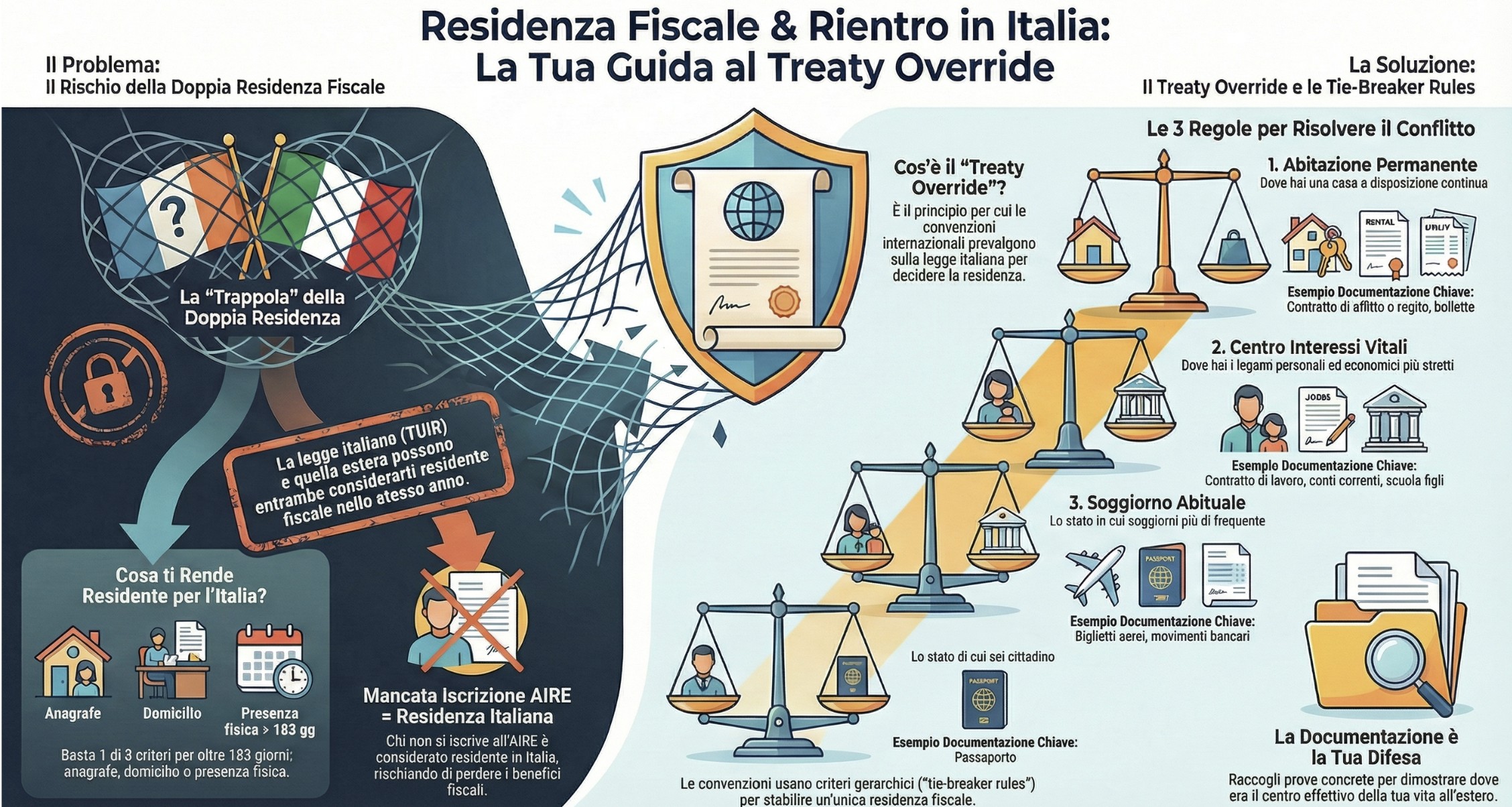 La corretta individuazione della residenza fiscale è il pilastro su cui poggia l’intera legittimità del regime impatriati. Tuttavia, molti contribuenti che pianificano il rientro in Italia per il 2026 si trovano ad affrontare “anni ibridi” (come il 2023 o il 2024), caratterizzati da una presenza fisica prolungata in Italia pur mantenendo legami economici e contratti di lavoro all’estero. In questi casi, la normativa nazionale (art. 2 del TUIR) entra spesso in conflitto con la realtà dei fatti. È qui che entra in gioco il concetto di treaty override e l’applicazione delle tie-breaker rules previste dai trattati internazionali.