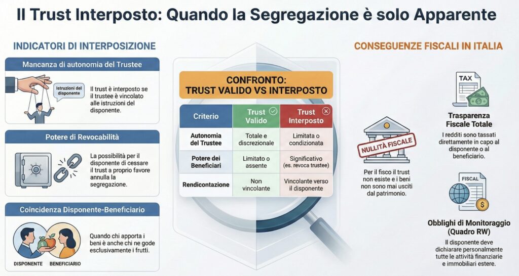 Un trust è considerato interposto quando il patrimonio non è realmente segregato e resta a disposizione del disponente. Gli elementi principali che fanno scattare questa qualifica sono la revocabilità del trust, la coincidenza tra disponente e beneficiario, o l’esercizio di un potere gestionale vincolante da parte del disponente sul trustee.