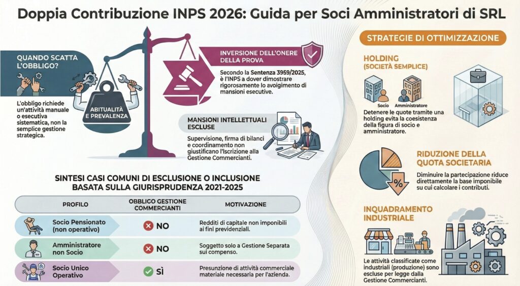 La doppia iscrizione INPS per il socio amministratore scatta solo in presenza di un’attività operativa abituale e prevalente, distinta dalla mera gestione. Questa guida aggiornata al 2026 analizza il ribaltamento dell’onere della prova (Sentenza n. 3959/2025) e le strategie legali (holding, cessione quote) per evitare la doppia imposizione.